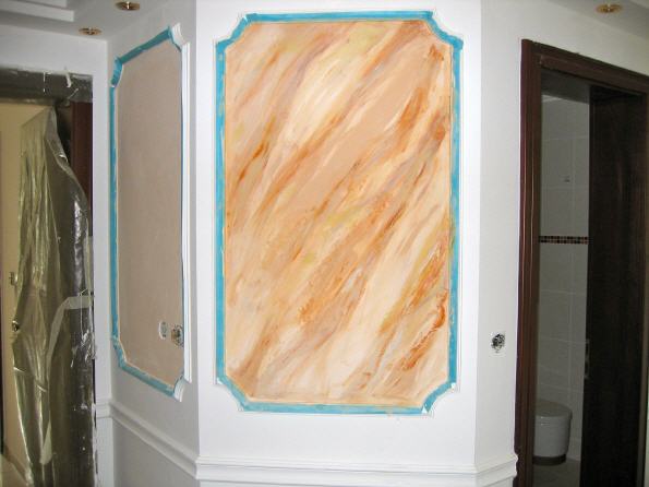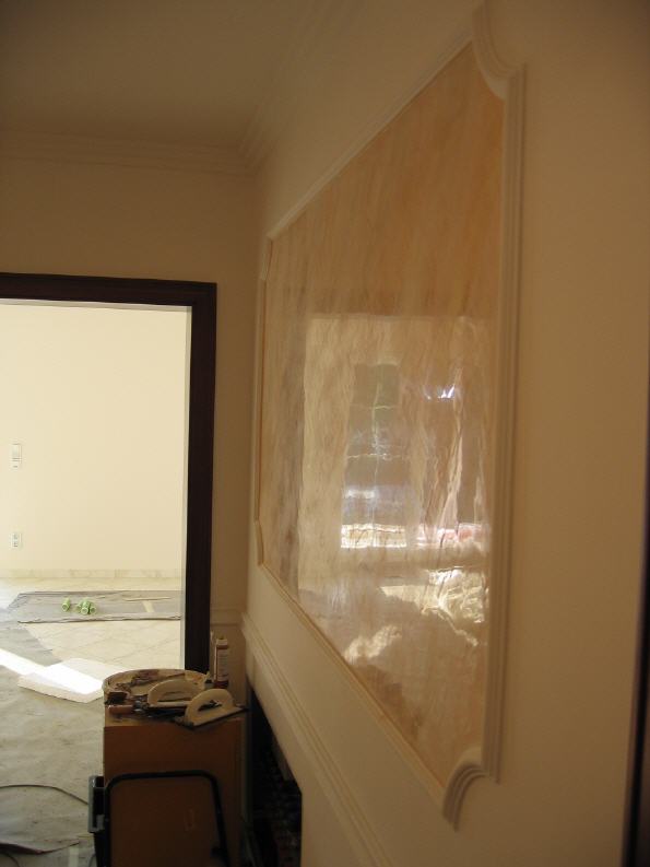 Außerdem lassen sich orientalische Ornamente integrieren. Mit der Kalkspachtelmasse werden in mindestens drei zeitlich versetzten Arbeitsgängen marmorartige Oberflächen hergestellt.