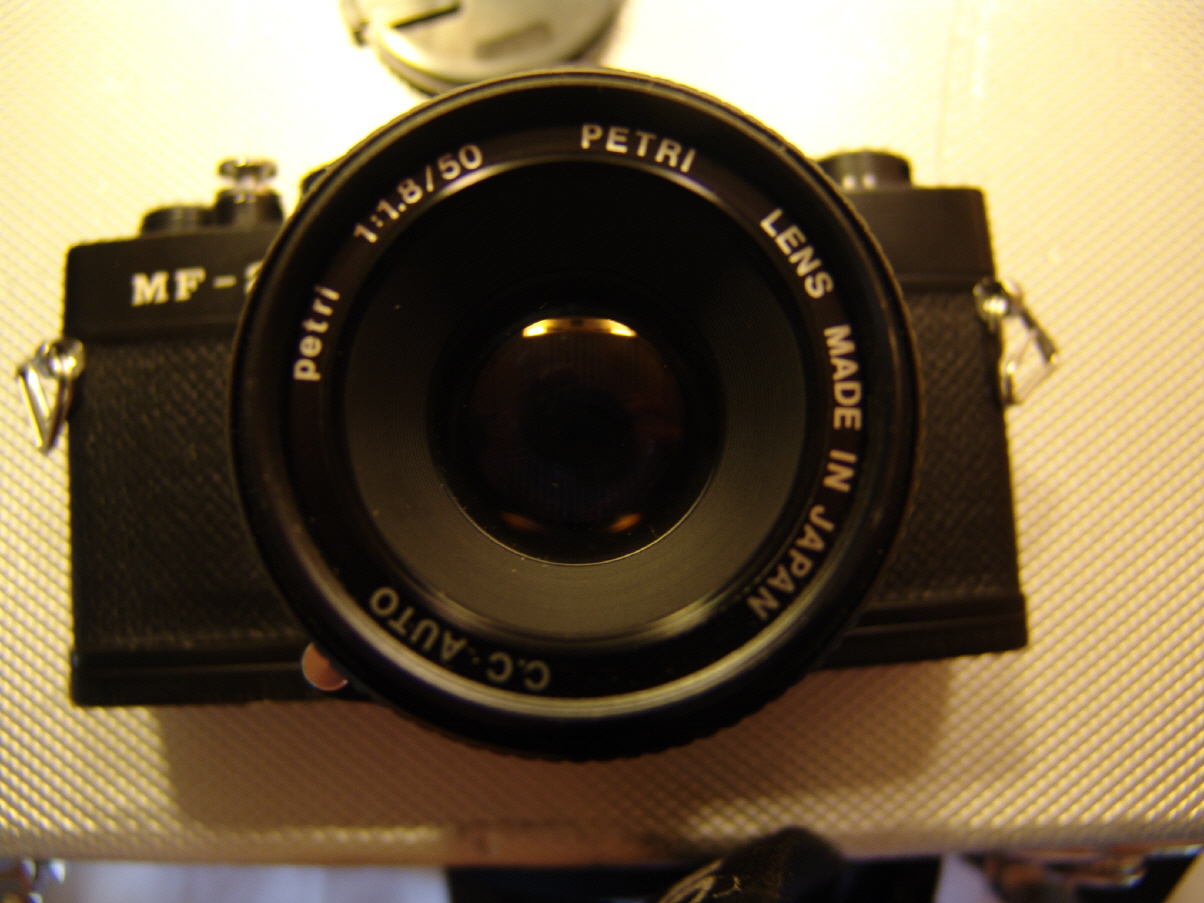 Objektive: klein: 1.8/50 mittel: f=35mm 1:28 groß: f=70 bis 220mm 1:4 Petri Spiegelreflexkamera MF-2 Elektronisch gesteuerter Stoff-Schlitzverschluss mit Belichtungszeiten von 4 Sek. bis 1/1000 Sek. + B + einzelne mechanische Zeit M Belichtungsmessung durch vorausgelöste Arbeitsblende, Belichtungsanzeige am oberen Sucherrand: + / ok / - Objektivanschluss: M42 Schraubgewinde Einstellbare Filmempfindlichkeit: 25 - 3200 ASA bzw. 15 - 36 DIN Selbstauslöser mit blinkender Leuchtdiode Sucher mit Schnittbild und Mikroprismenring
